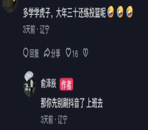 遼寧男籃本賽季的表現(xiàn)比較糟糕,主要是國內球員出現(xiàn)了斷檔的情況,外援選擇方面也不給力。在春節(jié)假期期間,不少球員都選擇了休息和放松,不過也有球員沒有松懈,而是在繼續(xù)提升自己。比如李虎翼,他甚至在除夕那天還在自己加練。有球迷看到俞澤辰23日發(fā)布的自己的騎馬視頻后,在下面留言,表示讓他學學虎子,大年三十還在練投籃呢。對此俞澤辰直接懟了回去,表示該球迷先別刷視頻了,該上班去。兩人的這一問一答引發(fā)了球迷熱議。
