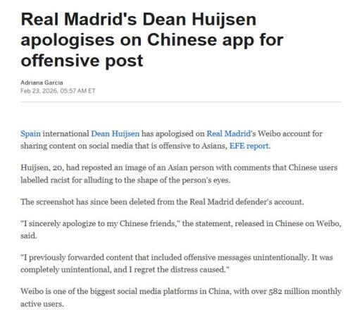 赫伊森轉(zhuǎn)發(fā)辱華圖片,皇馬俱樂部的微博特供道歉,無法讓中國(guó)球迷滿意。早在2024年,皇馬就卷入類似爭(zhēng)議事件。 此外,西班牙COPE電臺(tái)、《阿斯報(bào)》、《世界體育報(bào)》等媒體,也都關(guān)注赫伊森辱華事件,沙特媒體OKAZ也跟進(jìn)報(bào)道。不過,皇馬官方、赫伊森本人,都沒有在全球平臺(tái)發(fā)聲道歉。 |