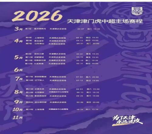 新賽季,新征程 天津津虎隊2026賽季中超聯(lián)賽 主場賽程正式出爐 其中,13場于泰達(dá)足球場舉辦 讓我們相聚泰達(dá) 為津門虎搖旗吶喊 共赴綠茵之約!