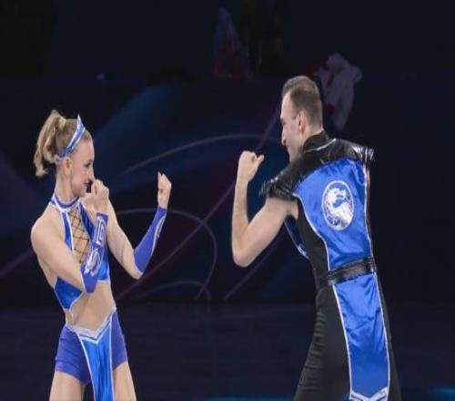 正是依托表演滑的創(chuàng)作自由度,梅特爾基娜與貝魯拉瓦決定以《真人快打》為核心主題完成表演,配樂選用了《真人快打》電影的經(jīng)典主題曲《Techno Syndrome》。 整場表演設(shè)計極具巧思:開場階段,兩人站在冰場邊緣模擬日常對話,梅特爾基娜提議去觀看花樣滑冰表演,貝魯拉瓦則表示更想玩電腦游戲,并提出教搭檔玩游戲,隨后兩人身著《真人快打》中經(jīng)典角色吉塔娜、絕對零度的造型登場,正式開啟冰上表演。