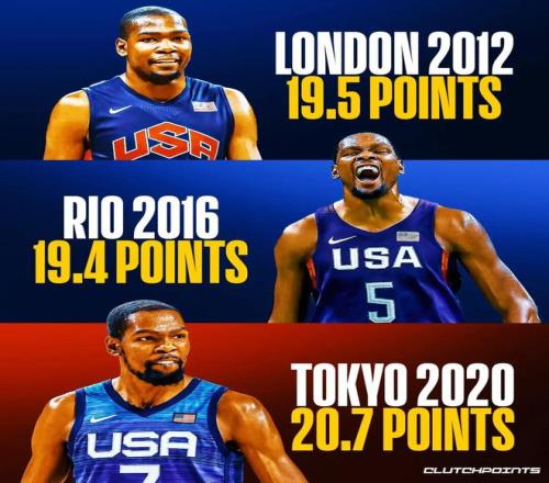 杜蘭特是美國男籃奧運會的歷史得分王,也是隊史當之無愧的第一人,他一共參加過四屆奧運會,四次全部拿到金牌,且前三次都是隊內(nèi)得分王: ——2012年倫敦奧運會,場均19.5分 ——2016年里約奧運會,場均19.4分 ——2020年東京奧運會,場均20.7分