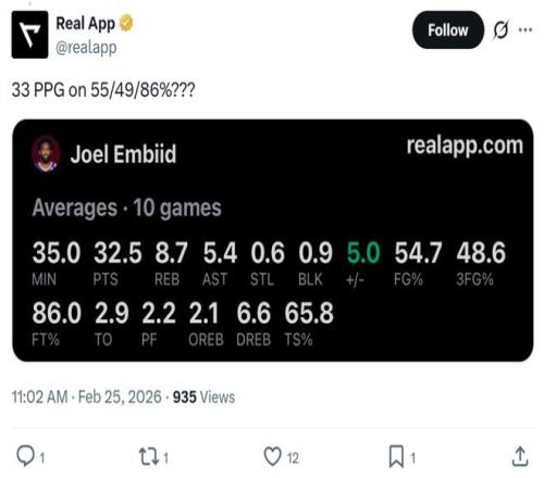 恩比德則交出更加高效的進(jìn)攻表現(xiàn),全場(chǎng)僅出戰(zhàn)26分鐘,17投11中,三分4中1,兩分球13投10中,輕松交出27分6板5助1帽。 這也是恩比德近一個(gè)月火爆狀態(tài)的縮影,過(guò)去10場(chǎng)比賽中,恩比德場(chǎng)均可以拿下32.5分8.7板5.4助華麗數(shù)據(jù),并且三項(xiàng)命中率高達(dá)55/49/86%,真實(shí)命中率65.8%。 恩比德再一次用行動(dòng)證明,傷病是唯一能夠阻礙他的因素,只要能夠健康登場(chǎng),他依舊是這個(gè)聯(lián)盟中最好的內(nèi)線球員之一。