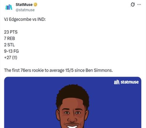 雙核轟59+15+13全能數(shù)據(jù),恩比德持續(xù)暴走夢(mèng)回巔峰!超級(jí)探花埃奇庫(kù)姆更該夸,高效轟23+7在場(chǎng)凈勝27分成76人近10年來(lái)首人+隊(duì)史第一助飛費(fèi)城成為大黑馬攪局東部。