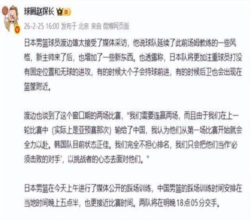 北京時間2月26日18:05,中日男籃將在世界杯預(yù)選賽窗口期迎來直接對話。賽前,日本隊核心球員渡邊雄太在接受媒體采訪時,釋放出強(qiáng)烈戰(zhàn)意——“我們不關(guān)心排名,只把中國和韓國當(dāng)作必須擊敗的對手?!?/p>