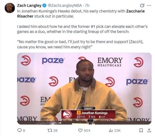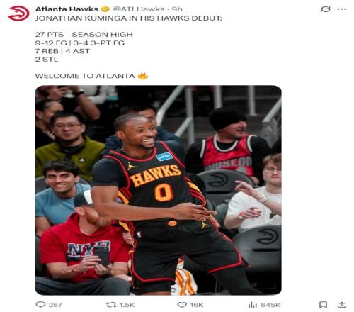 這場(chǎng)比賽是喬納森-庫(kù)明加老鷹生涯的首秀,此前勇士用庫(kù)明加+希爾德?lián)Q走了波爾津吉斯,此役庫(kù)明加全場(chǎng)比賽24分鐘,12中9,三分4中3,罰球7中6,拿到27分7籃板4助攻2搶斷,命中率75%,三分命中率75%,真實(shí)命中率89.5%,正負(fù)值+16。