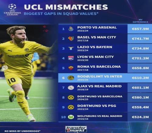 賽后數(shù)據(jù)刺眼得讓人心寒:國米全隊身價4.1億歐元,首發(fā)總身價更是高達(dá)數(shù)億,而博德閃耀全隊身價僅4260萬歐元。兩隊身價差高達(dá)6.1億歐元,這在歐冠歷史上足以排進(jìn)“以弱勝強”的前十名。
