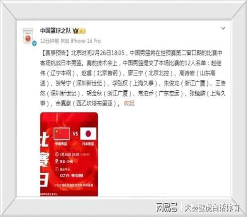 相對而言,高詩巖能夠繼續(xù)入選,郭士強看中的是其拼命三郎式的防守風(fēng)格,可以防守日本隊的箭頭球員。 本次世預(yù)賽,日本男籃也非??粗嘏c中國隊的較量,包括日本主帥和多名球員在內(nèi)賽前接受采訪時表示,一定能在主場戰(zhàn)勝中國隊,取得3連勝! 隨著12人終極名單的出爐,球迷紛紛熱議: “郭指導(dǎo)終于聽勸了,胡明軒進攻和防守都拉胯,落選對中國男籃有利~” “高詩巖真的是一招鮮吃遍天,期待能鎖住日本隊的得分后衛(wèi)!” “龐崢麟和郭昊文能入圍的話,后場不輸日本隊?!?/strong> “周琦哪去了?大魔王不在,內(nèi)戰(zhàn)防守堪憂!” 隨著胡明軒和趙嘉義落選,中國男籃對陣日本男籃首發(fā)預(yù)測如下: 后衛(wèi):趙繼偉+趙睿; 鋒線:張鎮(zhèn)麟+朱俊龍; 內(nèi)線:胡金秋。 對于中國男籃來說,與日本隊的比賽是名副其實的生死戰(zhàn)。 此前在第一窗口期,中國男籃主客場遭韓國隊雙殺,2連敗后排名小組倒數(shù)第二,若第3戰(zhàn)不能戰(zhàn)勝日本隊,先不提能否重返奧運會賽程,本次世預(yù)賽能否出線都是個問題。 根據(jù)賽程顯示,北京時間2月26日晚18點05分,中國男籃vs日本男籃的比賽將打響,CCTV5會全程直播本場焦點戰(zhàn)。 對于本次中國男籃終極12人大名單,大家有何看法?