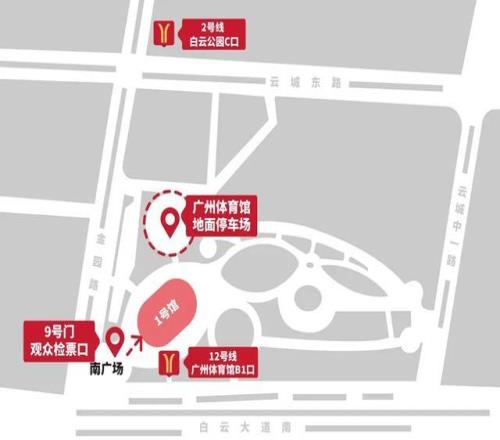 - 駕車: 地址:廣州市白云區(qū)白云大道783號 導航關鍵詞:廣州體育館地面停車場 - 停車: 若廣州體育館停車場停滿,可導航至云勝廣場停車場、凱德廣場云尚地下停車場、宏鼎云景匯地下停車場、廣州市兒童公園停車場、5號停機坪地面停車場等。 - 地鐵: 廣州地鐵2號線:從白云公園站下車,C出口出站后往東前行300米即到達場館; 廣州地鐵12號線:從廣州體育館站下車,B1出口出站后往廣州體育館方向前行50米,即到達場館。 - 公交: 途經(jīng)廣州體育館東門(白云大道南)公交線路: 223路、245路、76A路,76路、B81路快線,B81路,265路、大學城專線1路、38路; 途經(jīng)廣州體育館南門(金園路)公交線路: 547路、廣424路、34路、175路、529路、36路、544路、982路、795路; 途經(jīng)云城東路(體育花園)公交線路: 841路、522路、271路、36路、981路、929路、759路環(huán)線,529路,廣424路,982路。