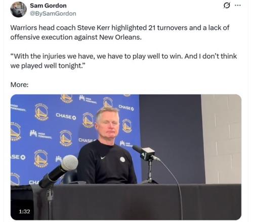 傷病是輸球主因 勇士之所以爆冷不敵鵜鶘隊(duì),核心原因是嚴(yán)重的傷病困擾,巴特勒賽季報(bào)銷、庫里、波神因傷缺席,霍福德、小庫里也缺陣,勇士幾乎傷了一整套首發(fā)陣容。 賽后科爾也談及這一話題:“鑒于我們目前的傷病情況,必須要打出高水準(zhǔn)才能贏球,而我認(rèn)為今晚我們的表現(xiàn)并不好?!?/p> 科爾還專門指出失誤與執(zhí)行力問題,強(qiáng)調(diào)球隊(duì)全場(chǎng)出現(xiàn)21次失誤太多,也正如科爾所說,由于傷病問題過于嚴(yán)重,現(xiàn)有勇士球員硬實(shí)力有限,想要贏球必須持續(xù)打出高水準(zhǔn),稍有偏差就會(huì)輸球,而本場(chǎng)勇士部分球員又表現(xiàn)不夠出色。