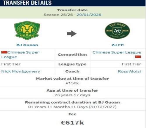 德轉(zhuǎn)更新,方昊從北京國(guó)安加盟浙江隊(duì)的轉(zhuǎn)會(huì)費(fèi)約500萬(wàn)人民幣。