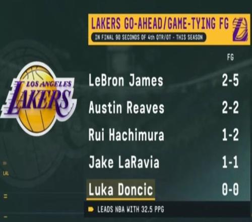 首先,本賽季第四節(jié)或加時最后90秒的扳平或反超球方面,身為NBA的得分王(場均32.5分)卻沒有一次出手。數(shù)據(jù)顯示,湖人其他球員在這個情況下的出手?jǐn)?shù)據(jù)如下:詹姆斯5中2,里夫斯2中2,八村壘2中1,拉拉維亞1中1,但東契奇是0中0。