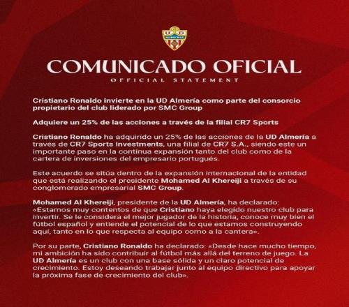 周四,C羅發(fā)表聲明表示收購西乙俱樂部阿爾梅里亞25%的股份。