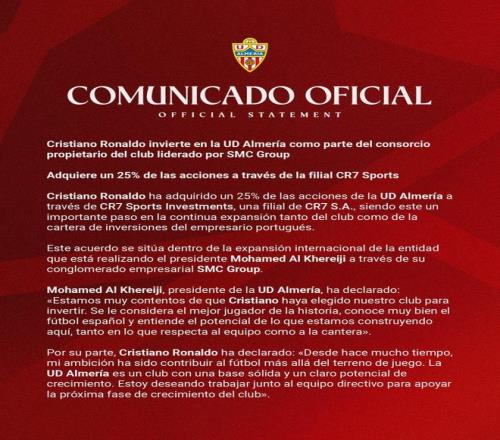 2月26日,西乙球隊(duì)阿爾梅里亞隊(duì)在官方宣布,C羅通過其公司CR7體育投資公司,收購球隊(duì)25%股份。 阿爾梅里亞在官方公告中寫道: 克里斯蒂亞諾-羅納爾多通過其公司CR7體育投資公司,成為俱樂部所有者團(tuán)隊(duì)中的一員。C羅已收購該俱樂部25%股份。