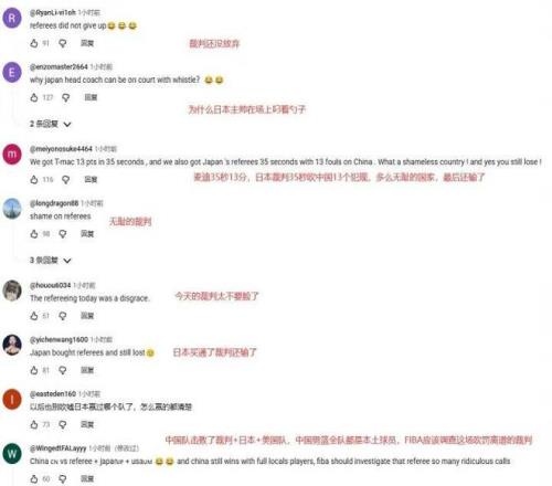 聽聽正義球迷的聲音 “為什么日本主帥在場上叼著哨子?” “麥迪35秒13分,日本裁判35秒吹中國13個犯規(guī),多么無恥的國家,最后還輸了” “今天的裁判太不要臉了” “中國隊擊敗了裁判+日本+美國隊,中國男籃全隊都是本土球員,F(xiàn)IBA應(yīng)該調(diào)查這場吹罰離譜的裁判”