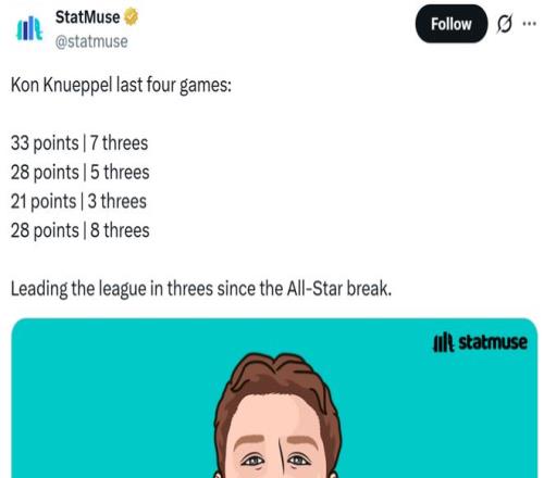 更讓人眼前一亮的是,克努佩爾幾乎沒有遭遇新秀墻,反而開季至今狀態(tài)一路呈現(xiàn)出上揚勢頭,全明星后的5場比賽克努佩爾合計命中多達26記三分高居同期聯(lián)盟第一。 因此美記Brett Siegel也發(fā)文期待他成為NBA歷史上第六位單季命中300+三分球的球員。 此前僅有庫里、克萊、哈登、比斯利與愛德華茲5人曾做到過這一壯舉,本場比賽結(jié)束后克努佩爾已經(jīng)命中209記三分,距離300記大關(guān)還差91記三分,剩余賽程還有23場比賽,他需要場均命中4記三分才能突破300記,雖然難度不小,但按照全明星至今的表現(xiàn)來看,克努佩爾完全有機會再度創(chuàng)造歷史。