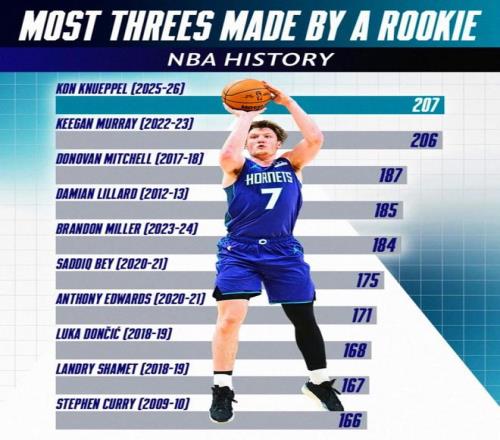 4號秀升歷史第一 作為一支擺爛數(shù)年無果的超級魚腩,黃蜂隊本賽季之所以能夠強勢崛起,用4號簽選中克努佩爾是關(guān)鍵轉(zhuǎn)折點,本場比賽他更是再度打破紀錄升至NBA新秀歷史第一。 全場克努佩爾僅出戰(zhàn)31分鐘,17中10,三分12中8,高效轟下28分4板2助1斷1帽全能數(shù)據(jù)。 單場命中8記三分追平其個人生涯紀錄,憑借這樣的表現(xiàn),克努佩爾本賽季已經(jīng)命中209記三分,不僅高居本賽季全聯(lián)盟第一,也讓其超越基根-穆雷的206記三分,創(chuàng)造新的NBA歷史新秀單賽季三分命中數(shù)紀錄。