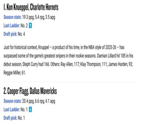 也正是憑借這樣的表現(xiàn),克努佩爾在NBA官網(wǎng)公布的最新一期新秀榜單中,成功超越“美國之子”弗拉格升至第一。 作為大學時期的隊友與室友,兩人本賽季均展現(xiàn)出歷史級別天賦,領(lǐng)跑最佳新秀爭奪戰(zhàn),未來兩人之間的競爭也將成為NBA新一代球星中最大的看點之一。