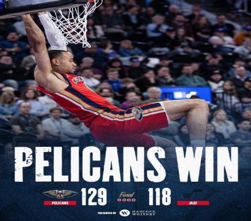 次節(jié)比賽,鵜鶘進(jìn)攻火力大幅提升,他們首次單節(jié)得分40+,且限制爵士進(jìn)攻火力暴跌,比首節(jié)少得到15分。鵜鶘單節(jié)41-23凈勝18分,上半場(chǎng)結(jié)束鵜鶘擴(kuò)大78-61領(lǐng)先爵士。 中場(chǎng)休息回來,鵜鶘第三節(jié)25-27輸?shù)?分,第四節(jié)26-30再輸4分,最終鵜鶘129-118戰(zhàn)勝爵士收獲3連勝,爵士遭遇4連敗。