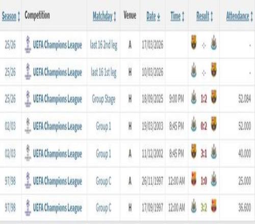 02-03雙方再次在小組賽相遇,巴薩主場3-1、客場2-0雙殺了紐卡,巴薩最終小組頭名出線,紐卡則小組第三出局,不過巴薩在16強(qiáng)中兩回合2-3遭到尤文淘汰。