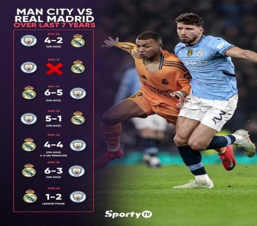 5年淘汰賽連續(xù)交鋒 這將是兩隊(duì)連續(xù)第5個(gè)賽季在歐冠淘汰賽里交鋒,自2021-22賽季以來,兩隊(duì)已經(jīng)連續(xù)4個(gè)賽季在淘汰賽里交鋒。 2021-22賽季,兩隊(duì)在半決賽里交鋒,首回合客場告負(fù)之后,皇馬次回合3比1取勝之后晉級決賽。2022-23賽季,兩隊(duì)再次在半決賽里交鋒,曼城首回合客場戰(zhàn)平,次回合4比0大勝之后晉級。 2023-24賽季,兩隊(duì)則在八強(qiáng)戰(zhàn)里交鋒,皇馬首回合主場3比3戰(zhàn)平。次回合兩隊(duì)再度戰(zhàn)平,皇馬最終依靠點(diǎn)球決戰(zhàn)淘汰曼城。在2024-25賽季,兩隊(duì)則在淘汰賽附加賽里交鋒,皇馬主客雙殺曼城之后晉級16強(qiáng)。 本賽季小組賽,奧萊利、哈蘭德的進(jìn)球幫助曼城客場2比1戰(zhàn)勝皇馬。兩隊(duì)已經(jīng)交鋒15次,皇馬取得6勝4平5負(fù)的成績,打入29球丟29球。在淘汰賽兩度交鋒,將是兩隊(duì)6年之內(nèi)第14次、15次交鋒。