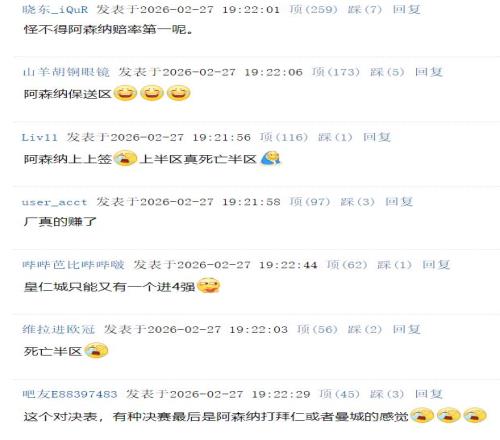 據(jù)預(yù)先設(shè)定好的落位,阿森納如果擊敗勒沃庫(kù)森晉級(jí),1/4決賽將面對(duì)附加賽晉級(jí)球隊(duì)博德閃耀和葡超球隊(duì)葡萄牙體育之間的勝者,隨后晉級(jí)四強(qiáng)的話,對(duì)手將在紐卡、巴薩、 馬競(jìng)、熱刺之間產(chǎn)生。 對(duì)此,國(guó)內(nèi)球迷紛紛熱議阿森納的抽簽結(jié)果: