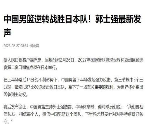 這次中國男籃為什么能夠戰(zhàn)勝強敵日本? 郭士強又說了些什么呢? 中國男籃逆轉(zhuǎn)擊敗日本隊