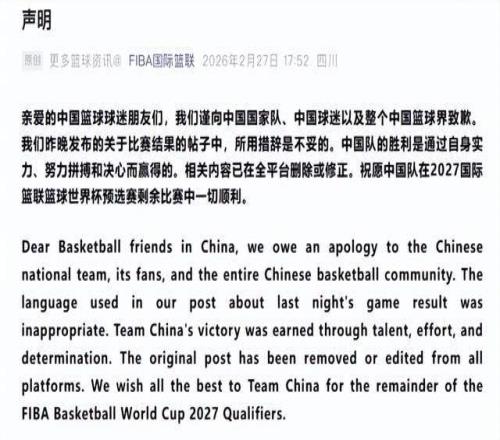 FIBA沉默了24小時。 直到輿論壓頂,才悄悄刪帖,改成了中性表述:“中國男籃下半場翻盤,擊敗日本男籃”。 但沒道歉。 直到今天,才在中文平臺發(fā)布一份“致歉聲明”: