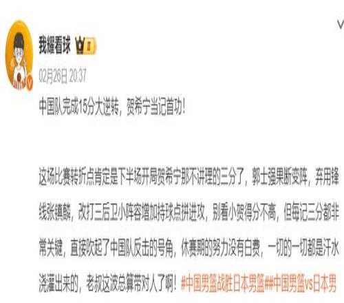 大V認(rèn)為這場(chǎng)比賽中國(guó)隊(duì)能完成15分逆轉(zhuǎn)賀希寧當(dāng)記首功,下半場(chǎng)開(kāi)局賀希寧不講理的三分讓郭士強(qiáng)改變陣容直接棄用了鋒線的張鎮(zhèn)麟改打三后衛(wèi)。 《半島都市報(bào)》、青島男籃隨隊(duì)記者杜金城賽后也表示,中國(guó)男籃這場(chǎng)比賽之所以能逆轉(zhuǎn),賀希寧、趙繼偉兩人居功厥偉,這兩人就是首功。 |