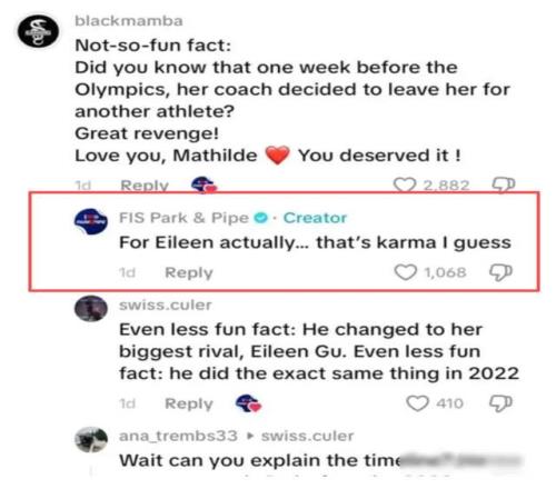 從“偷走勝利”到“這就是報應(yīng)” 而更要命的是:這并非孤例。 冬奧會期間,國際滑雪和單板滑雪聯(lián)合會(FIS)也踩過同樣的“雷”。FIS旗下官方TikTok賬號“FIS Park & Pipe”在一條關(guān)于瑞士選手瑪?shù)贍柕隆じ窭啄聤Z得女子坡面障礙技巧金牌的視頻評論區(qū),先有網(wǎng)友拋出所謂“不那么有趣的事實”,聲稱格雷莫德的教練在冬奧前一周“離開她去帶另一名運(yùn)動員”,并把奪金形容為“復(fù)仇”“是你應(yīng)得的”。該官方賬號隨后竟跟評稱:“對谷愛凌而言……我猜這就是所謂的‘因果報應(yīng)’?!卑压葠哿栉茨軍Z金輕飄飄地歸因為“karma”(常被理解為“現(xiàn)世報”)。事件引發(fā)外界強(qiáng)烈不滿后,相關(guān)評論被刪除;據(jù)報道,F(xiàn)IS也就此致歉。 是不是很相似?把未核實的傳聞塞進(jìn)勝負(fù)敘事;用帶道德評判的詞匯替“事實”下結(jié)論;官方賬號下場“發(fā)聲”,把完全不負(fù)責(zé)任的情緒發(fā)泄,偽裝成了權(quán)威的態(tài)度;最后都是刪評和道歉來止損。只是更深層的問責(zé)、復(fù)盤好像遲遲未來。