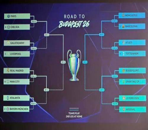 歐冠1/8決賽對(duì)陣:(種子隊(duì)在后,先客后主) 巴黎圣日耳曼VS切爾西 加拉塔薩雷VS利物浦 皇家馬德里VS曼城 亞特蘭大VS拜仁慕尼黑 紐卡斯?fàn)朧S巴塞羅那 馬德里競(jìng)技VS熱刺 博德閃耀VS葡萄牙體育 勒沃庫森VS阿森納 歐聯(lián)淘汰賽16強(qiáng)對(duì)陣