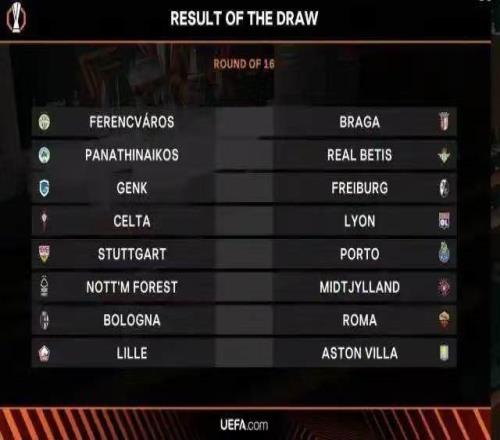 弗賴堡vs亨克 羅馬vs博洛尼亞 布拉加vs費(fèi)倫茨瓦羅斯 波爾圖vs斯圖加特 中日德蘭vs諾丁漢森林 皇家貝蒂斯vs帕納辛奈科斯 阿斯頓維拉vs里爾 里昂vs塞爾塔 歐協(xié)1/8決賽對(duì)陣