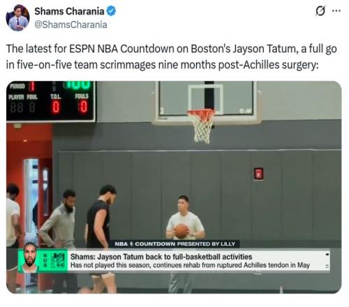 根據(jù)此前名記Shams報(bào)道,塔圖姆已經(jīng)全程參與5v5對抗訓(xùn)練,但在何時(shí)復(fù)出方面,凱爾特人依舊十分謹(jǐn)慎,完全遵循塔圖姆的感覺與意愿。