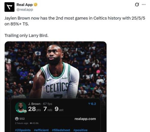 這是杰倫布朗生涯第4次單場以85%+的真實(shí)命中率拿下至少25分5板5助,成功追平隊(duì)史名宿皮爾斯并列綠軍隊(duì)史第二,僅次于拉里伯德的5次。