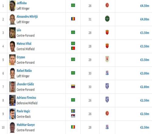 投入315萬歐元簽入拉唐、蓋伊之后,上海申花的身價達(dá)到1521萬歐元,僅次于上海海港,浙江隊(duì)、山東泰山分別以1353萬、1334萬排名第三、第四位。 升班馬遼寧鐵人則以1301萬歐元排名第5位,熱菲尼奧以450萬歐元的身價成為中超身價最高的球員,力壓米特里策(400萬)以及身價達(dá)到350萬的維塔爾、克雷桑、萊昂納多。
