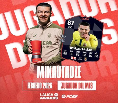 北京時(shí)間2月28日,官方消息,比利亞雷亞爾前鋒米卡塔澤當(dāng)選西甲2月最佳球員。