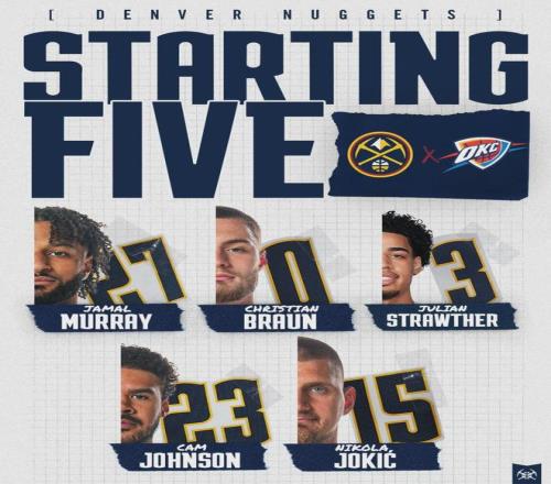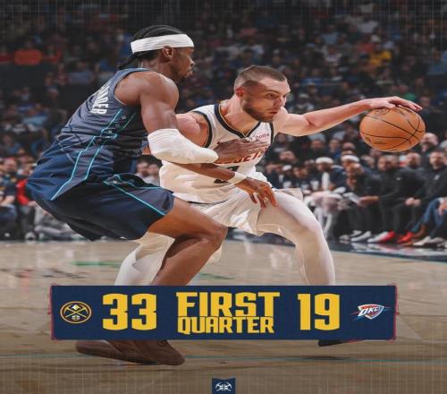 雷霆本場首發(fā):亞歷山大、卡森-華萊士、多爾特、霍姆格倫、哈爾滕斯泰因。掘金首發(fā):穆雷、布勞恩、斯特勞瑟、卡梅倫-約翰遜、約基奇。說回比賽,約老師開局手感不佳,首節(jié)投籃8中2。但其他隊(duì)友夠準(zhǔn),掘金單節(jié)三分11中7!