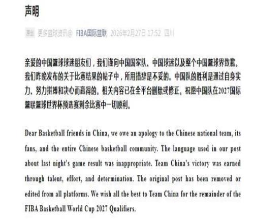 FIBA發(fā)布聲明為措辭不當(dāng)向中國男籃及球迷致歉