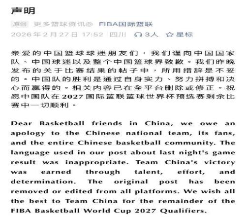 不僅如此,F(xiàn)IBA官方還發(fā)布聲明,表示在中國男籃戰(zhàn)勝日本男籃的比賽結(jié)果帖子中的措辭不當(dāng),而向中國男籃、中國球迷以及整個中國籃球界致歉。這則道歉聲明使用了中英雙語,不僅通過中文官方發(fā)出,還在引起誤會的Instagram官方賽果帖的評論區(qū)同步了道歉的內(nèi)容。這樣來看的話,F(xiàn)IBA的道歉還是非常有誠意的。只是希望在以后的比賽中,F(xiàn)IBA官方也能要求裁判做到公平公正,不要再那么明顯針對中國男籃了。