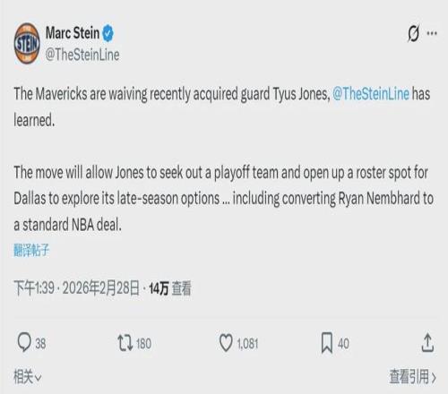 北京時(shí)間2月28日,據(jù)NBA名記Shams報(bào)道,太陽(yáng)正式裁掉了后衛(wèi)科爾-安東尼。由于科爾-安東尼在3月1日之前被裁,他有資格代表新球隊(duì)出戰(zhàn)季后賽。但是截至目前,還沒有球隊(duì)表達(dá)興趣。同樣是今天,獨(dú)行俠裁掉了泰厄斯-瓊斯。