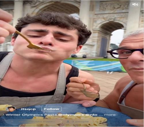 NBC邀請了Gianluca Conte (@itsQCP) 前往開幕式、演播室和各種活動現(xiàn)場,這位頗受歡迎的網(wǎng)紅將視頻發(fā)布到他的Instagram故事中,與他的340萬粉絲分享。他以烹飪內(nèi)容聞名,這次還發(fā)布了一段與一位意大利廚師合作的視頻,他們用奧運五環(huán)意面制作了一道菜肴,并在和平拱門前的奧運圣火旁享用了這道菜。“這比他寫‘這是我在米蘭-科爾蒂納冬奧會的每日博客’要真實得多?!盞arapetyan說。