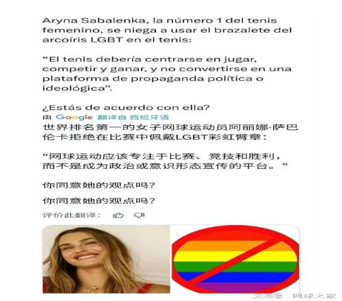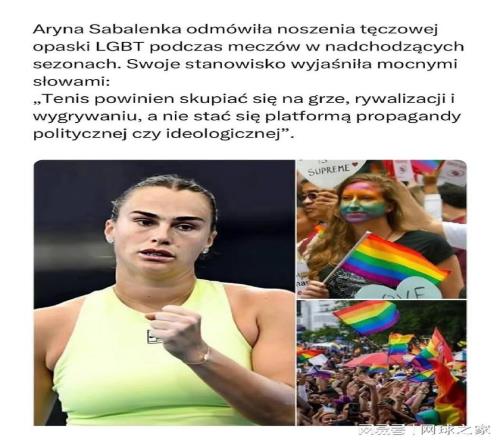 而就在網(wǎng)壇為“憤怒屋”的溫情與創(chuàng)意點(diǎn)贊時(shí),并未參加中東賽季的世界第一薩巴倫卡,卻在社交網(wǎng)絡(luò)上“躺槍”。 近日,一則帖子在外網(wǎng)瘋狂傳播。帖主聲稱,阿琳娜·薩巴倫卡已“拒絕在未來(lái)賽季的比賽中佩戴LGBT彩虹手環(huán)”,并配以強(qiáng)硬的言辭闡述其立場(chǎng):“網(wǎng)球應(yīng)該專注于比賽、競(jìng)爭(zhēng)與勝利,而不是成為政治或意識(shí)形態(tài)宣傳的平臺(tái)?!?/p>