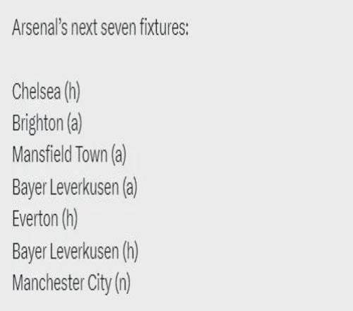 阿森納未來(lái)7場(chǎng)比賽:主戰(zhàn)切爾西、客戰(zhàn)布萊頓、客戰(zhàn)曼斯菲爾德、客戰(zhàn)勒沃庫(kù)森、主戰(zhàn)埃弗頓、主戰(zhàn)勒沃庫(kù)森、聯(lián)賽杯決賽對(duì)曼城 到了這個(gè)時(shí)候,也就無(wú)所謂難易之分了,關(guān)鍵是爭(zhēng)取拿下每場(chǎng)比賽,每一分可能都是爭(zhēng)冠或丟冠的關(guān)鍵,每場(chǎng)比賽可能都左右一個(gè)賽事的成敗。 但還是那句話,相對(duì)來(lái)說(shuō),阿森納的賽程已經(jīng)是非常有利了。 剩余的英超賽事里,阿森納只剩客場(chǎng)布萊頓、狼隊(duì)和曼城需要離開(kāi)倫敦,客場(chǎng)里程是最少的;卡拉寶杯的話,決賽在中立場(chǎng)地(實(shí)際上在倫敦,算半個(gè)主場(chǎng)),沒(méi)啥好說(shuō),而且賽前曼城壓力更大;足總杯的話,對(duì)手是曼斯菲爾德;歐冠的話,上面也說(shuō)了,而且還有隱藏福利……
