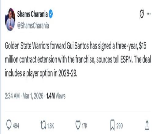 3年1500萬(wàn)續(xù)約奇兵 在湖勇焦點(diǎn)戰(zhàn)開(kāi)打前,名記Shams曝出勇士提前以一份3年1500萬(wàn)美元合同續(xù)約了桑托斯,合同包含28-29賽季球員選項(xiàng)。 作為22年的55號(hào)秀,桑托斯今夏將成為受限制自由球員,被勇士隊(duì)選中后他一直默默無(wú)聞,本賽季球隊(duì)遭遇傷病困擾后,桑托斯成功抓住機(jī)會(huì)完成自我證明 尤其是過(guò)去一個(gè)月,桑托斯進(jìn)一步暴走,過(guò)去13場(chǎng)比賽中12次得分上雙,場(chǎng)均可以交出15分5.6板3.8助1.6斷全能數(shù)據(jù),投籃命中率58.8%,三分命中率43.1%。