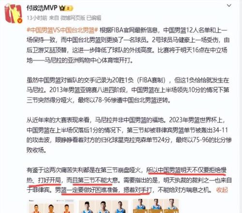 馬尼拉并不是中國隊的福地,在這個地方中國隊曾經(jīng)兩次翻車。2013年男籃亞錦賽八進(jìn)四階段,中國男籃在上半場領(lǐng)先10分的情況下第三節(jié)突然啞火,最終以78-96慘遭臺北男籃逆轉(zhuǎn)。時隔10年,也就是2023年男籃世界杯上,中國隊上半場僅落后1分,但第三節(jié)又突然啞火,被菲律賓男籃以96-75大比分擊敗。只能說馬尼拉是中國男籃的傷心地。盡管對手是省隊,但是國家隊來不得半點(diǎn)輕視和大意。