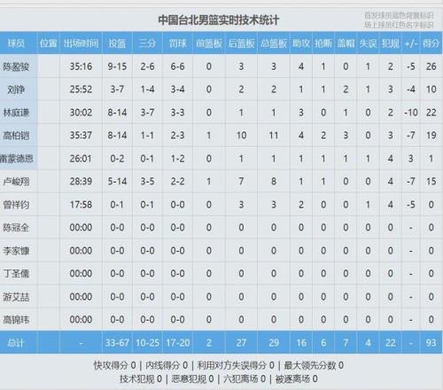 陳盈駿26分3板4助、林庭謙22分3助、高柏鎧19分11板4助2斷3帽、盧峻翔15分8板。最后看看數(shù)據(jù),說(shuō)說(shuō)你的感受: