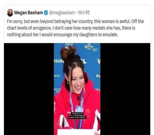 美國(guó)作家兼記者M(jìn)egan Basham寫道: 抱歉,即便拋開背叛這一點(diǎn)不談,這個(gè)女人也糟糕透了 她的回應(yīng)方式很“谷愛凌”:不陷入無休止的辯論,而是用行動(dòng)不斷定義。 她說“北京是我的家,我是一個(gè)北京女孩”。她在國(guó)際場(chǎng)合被自然地稱為“中國(guó)運(yùn)動(dòng)員”。她在中式教育和美式自由之間,找到了一個(gè)詭異的平衡點(diǎn):既有中國(guó)式的紀(jì)律和野心,又有美式的不設(shè)限和自信表達(dá)。