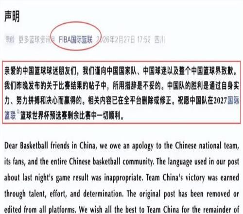 消息一經(jīng)擴散,網(wǎng)絡平臺瞬間沸騰,評論區(qū)怒潮洶涌,無數(shù)球迷留言質(zhì)問不公,集體敦促中國籃協(xié)挺直腰桿、主動出擊,為中國隊正名、為尊嚴發(fā)聲。 迫于強大輿論壓力,F(xiàn)IBA于2月27日緊急發(fā)布中英文雙語致歉聲明,承認用語嚴重失當,肯定中國隊技戰(zhàn)術(shù)表現(xiàn)與頑強意志,并悄然撤下原帖、替換為修正后文案。