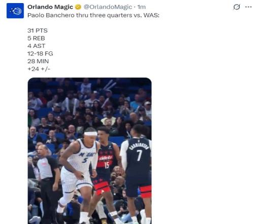 三節(jié)打完班凱羅28分鐘,18中12,三分2中1,罰球7中6,拿到31分5籃板4助攻,命中率66.7%,三分命中率50%,正負(fù)值+24。