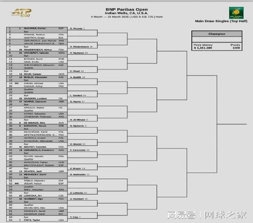 北京時間今晨,2026賽季ATP/WTA1000美國印第安維爾斯公開賽官宣了單打正賽簽表。男子方面:世界前十悉數(shù)出戰(zhàn),前八大種子的對位如下:上半?yún)^(qū),阿爾卡拉斯--德米納爾、德約科維奇--弗里茨;下半?yún)^(qū),穆塞蒂--茲維列夫、謝爾頓--辛納。中國沒有球員進入正賽簽表,但有兩位球員出戰(zhàn)資格賽,他們是香港球員黃澤林和臺灣球員曾俊欣。