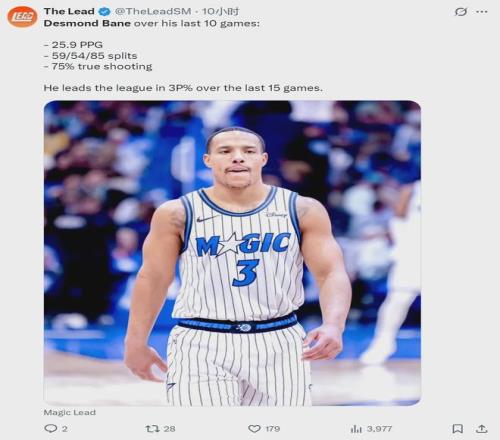 最近10場比賽,魔術(shù)后衛(wèi)貝恩場均能砍下25.9分,投籃命中率59.3%,三分命中率53.7%,罰球命中率84.9%,真實(shí)命中率高達(dá)75%。過去15場比賽,貝恩的三分命中率領(lǐng)跑全聯(lián)盟。截至今天賽前,魔術(shù)32勝28負(fù)暫列東部第七。